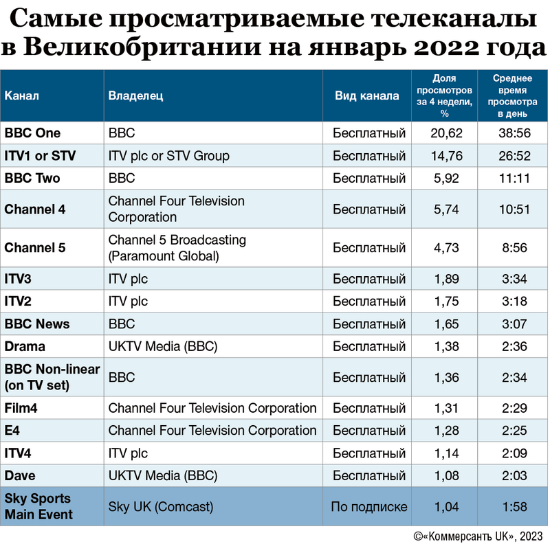 Британское телевидение считается одним из самых успешных в коммерческом плане, наряду с американским: местные шоу, фильмы и сериалы часто покупаются для трансляции за рубежом. За 85 лет в стране появилось около пятисот каналов — некоторые из них можно смотреть бесплатно, за другие же необходимо платить. Британцы часто экономят, выбирая специальный пакет услуг от одного из местных провайдеров, в который входят пользование интернетом и доступ к нескольким телевизионным каналам. Телерадиовещание в Великобритании делится на общественное и коммерческое. Наиболее популярными считаются пять общенациональных каналов — BBC One, BBC Two, ITV, Channel 4 и Channel 5. Компании производят примерно 27 тыс. часов контента и приносят своим владельцам более 2,6 млрд евро в год. «Акцент UK» рассказывает о возникновении британского ТВ и самых крупных игроках местного телерынка.
