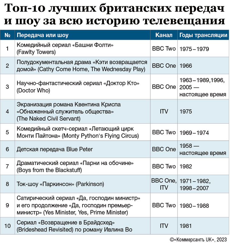 В 2000 году Британский институт кино (BFI) опубликовал рейтинг лучших британских телевизионных передач — и хотя туда не вошли произведения, созданные позднее, рейтинг полезен как указание на то, какие программы пользовались популярностью у британцев в XX веке.